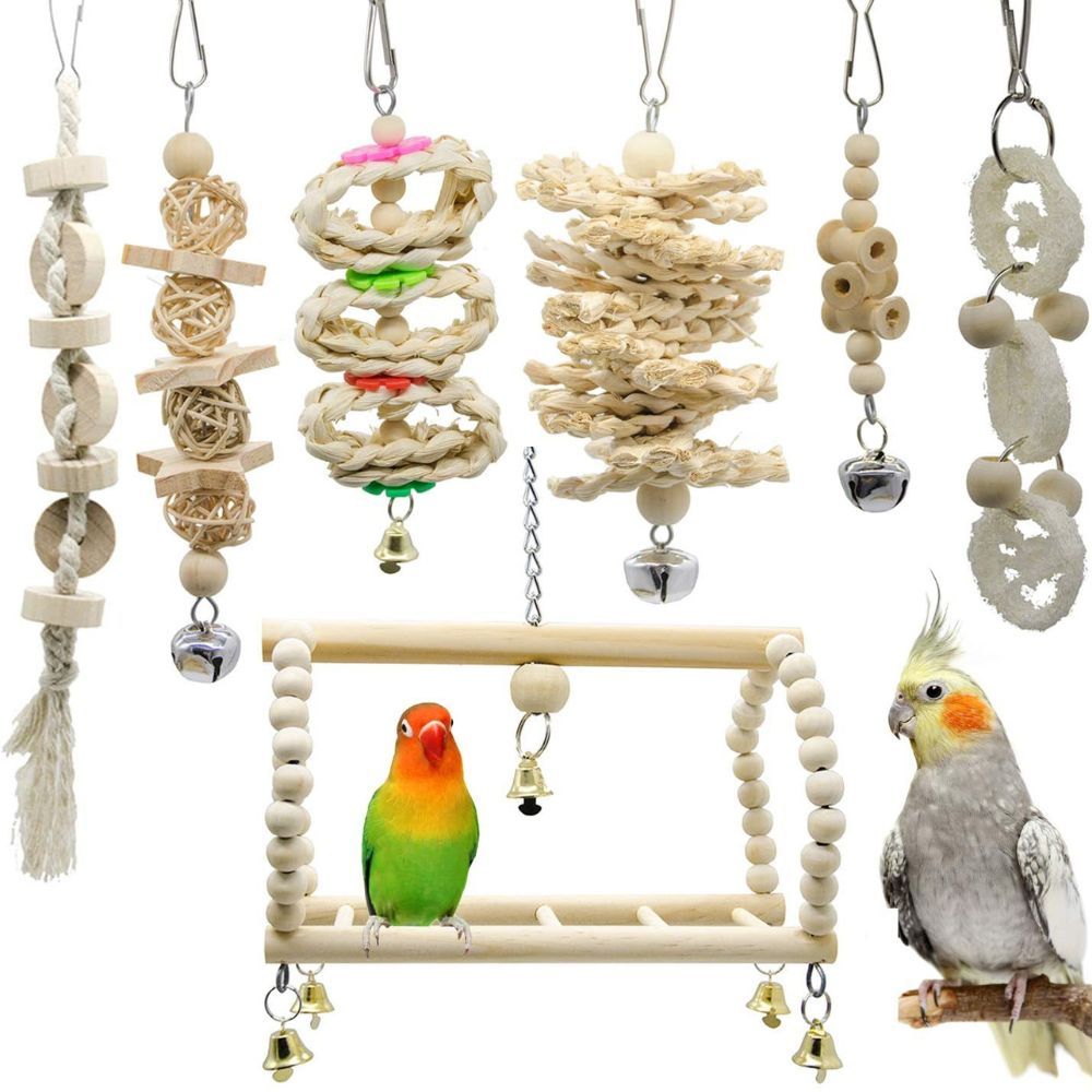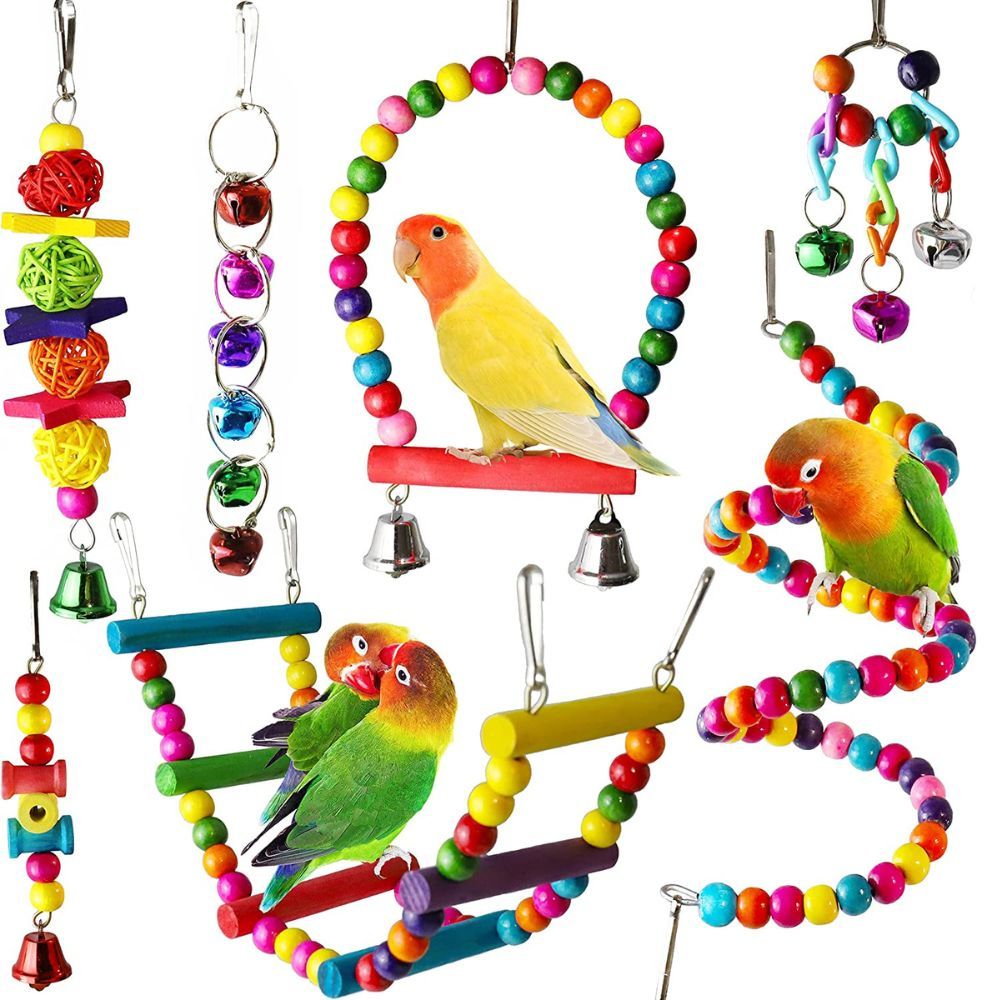 Don’t let your pet feathered friend get bored, give them something to squawk about with our 7 Pcs Bird Parakeet Cockatiel Toys! Get chirping over these colorful, chewable and fun add-ons for any parrot cage. Your bird will be fully equipped for hours of fun and activities with our set of 2 chewing toys, 2 hanging bells toys, and 3 bird swing toys. Ropes are also included for climbing and balancing, helping to strengthen your bird's muscles and improve coordination. Lovebirds can pick up and manipulate the toys with their beaks and feet, which promotes dexterity and keeps them engaged. Not only will it keep them busy, but also help promote mental strength, physical agility and coordination - which means happy birds everywhere! With this wide variety of shapes, textures, colors and designs all in one package – you can bet that your feathered pal won’t go unnoticed or unsatisfied. After all, why WOULDN’T you provide your best buddy with the best? So let’s give our parrot pals something to really tweet about - 7 Pcs Bird Parakeet Cockatiel Toys!