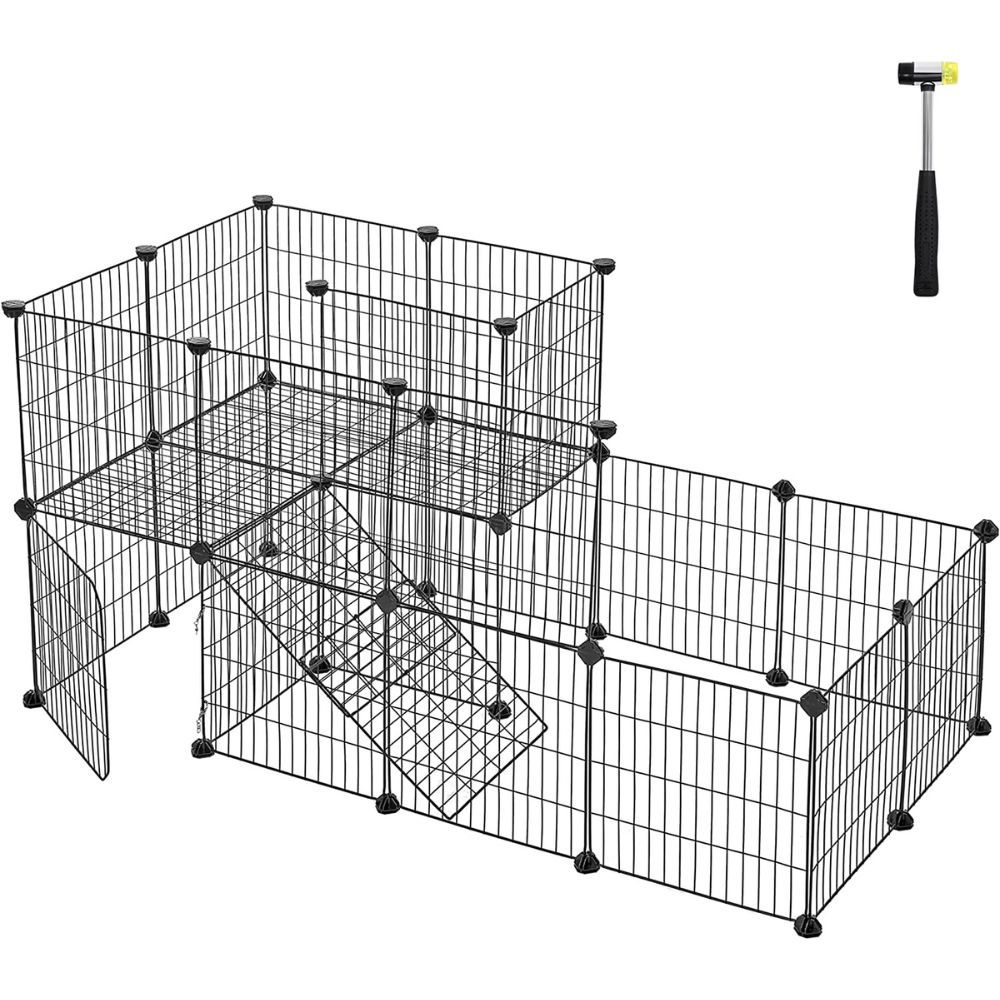 Welcome to your pet’s new favorite play area! The SONGMICS Pet Playpen is designed with piggie lovers in mind. This large 56.3” x 28.7” playpen offers plenty of room for your furry little pal to run, jump, nibble and much more! With 1.5 levels and a ramp, it’s almost like they’re siblings to flip their way through the cozy house! Plus, we’ve made sure safety is top of mind; the wire spacing has been laser-engineered with a 1” gap so there’s no chance for escape or tiny legs getting caught. For extra protection from other pets or small children, consider adding a lid to the playpen. Assembling is simple and fun - just join the 27 panels plus 1 wire mesh door by the 37 connectors, throw in our special rubber hammer and voila! Your pet can start exploring her home instantly and you can relax knowing she’s safe inside. So go ahead guinea pig lovers, let your furry friend have some fun – it’ll be piggly wiggly time before you know it!