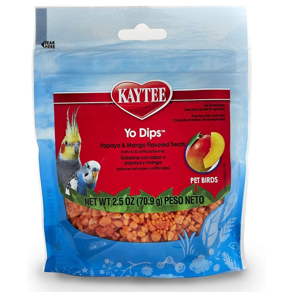 Kaytee Yo Dips Papaya & Mango Flavored Treats for All Pet Birds are a great option for training your feathered friend. These treats are made of dried papaya, maltodextrins, partially hydrogenated soybean oil, sugar, partially hydrogenated palm oil, reduced lactose whey powder, dried nonfat yogurt powder, and lecithin. While my ringneck loves these treats, they are quite sweet, which is something to keep in mind. In fact, we even tried one and they were good. WE found that they were a bit too sweet for my taste, although they had a slight aftertaste that reminded me of a squishy nerd. For this reason, it is important to remember moderation when giving your pet these treats. Breaking larger pieces into smaller portions and giving only a couple of the tiny pieces can help ensure that your pet is enjoying these treats in a safe and healthy way.